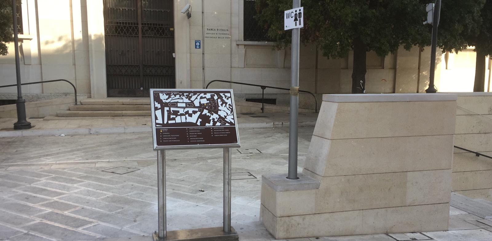 Deux cartes tactiles situées aux deux extrémités du centre historique, à proximité de l’Auditorium et de la Place Vittorio Veneto, permettront à ceux qui ne voient pas l’imagination de l’ancien développement urbain du cœur de Matera, notamment en ce qui concerne l’identification des monuments et des monuments historiques. des sites les plus importants: l'église du Purgatoire, l'église de Sant'Eligio, la Place et l'église de San Francesco, le conservatoire, la Place du Sedile, l'église de S. Lucia, ainsi que les principaux services, y compris l'ascenseur aux Sassi.