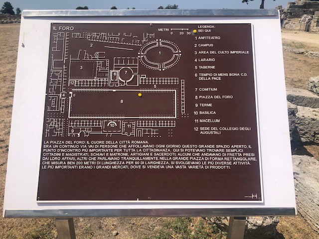 Ainsi 8 panneaux en relief ont été créés avec les monuments les plus importants : les temples d'Athéna, d'Héra et de Neptune, l'Amphithéâtre, l'Ekklesiasterion grec, le Comitium romain avec le Temple de la Paix, la grande zone du forum romain avec les temples, les tabernae, la basilique et le macellum, et bien sûr un panneau d'ensemble du Parc, qui en plus des monuments montre l'entrée et la sortie du parc, la billetterie, les toilettes et l'itinéraire principal pour visiter le parc.