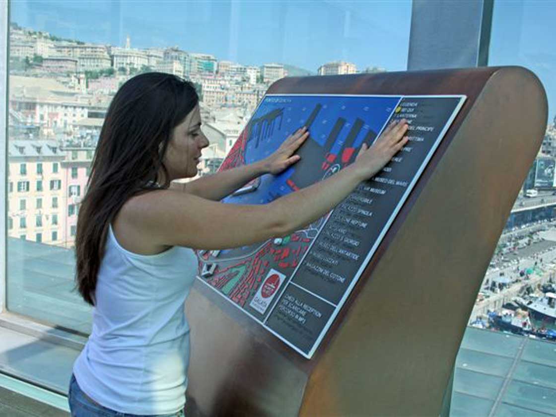 Happy Vision a réalisé des cartes tactiles en relief et modelées, au MUMA Musée de la Mer, à la Spianata Castelletto et au Porto Antico, cartes qui représentent le Golfe et ses monuments : elles sont à plusieurs reliefs et en plusieurs couleurs, modelées de façon à représenter la pente qui descend de la colline à la mer.